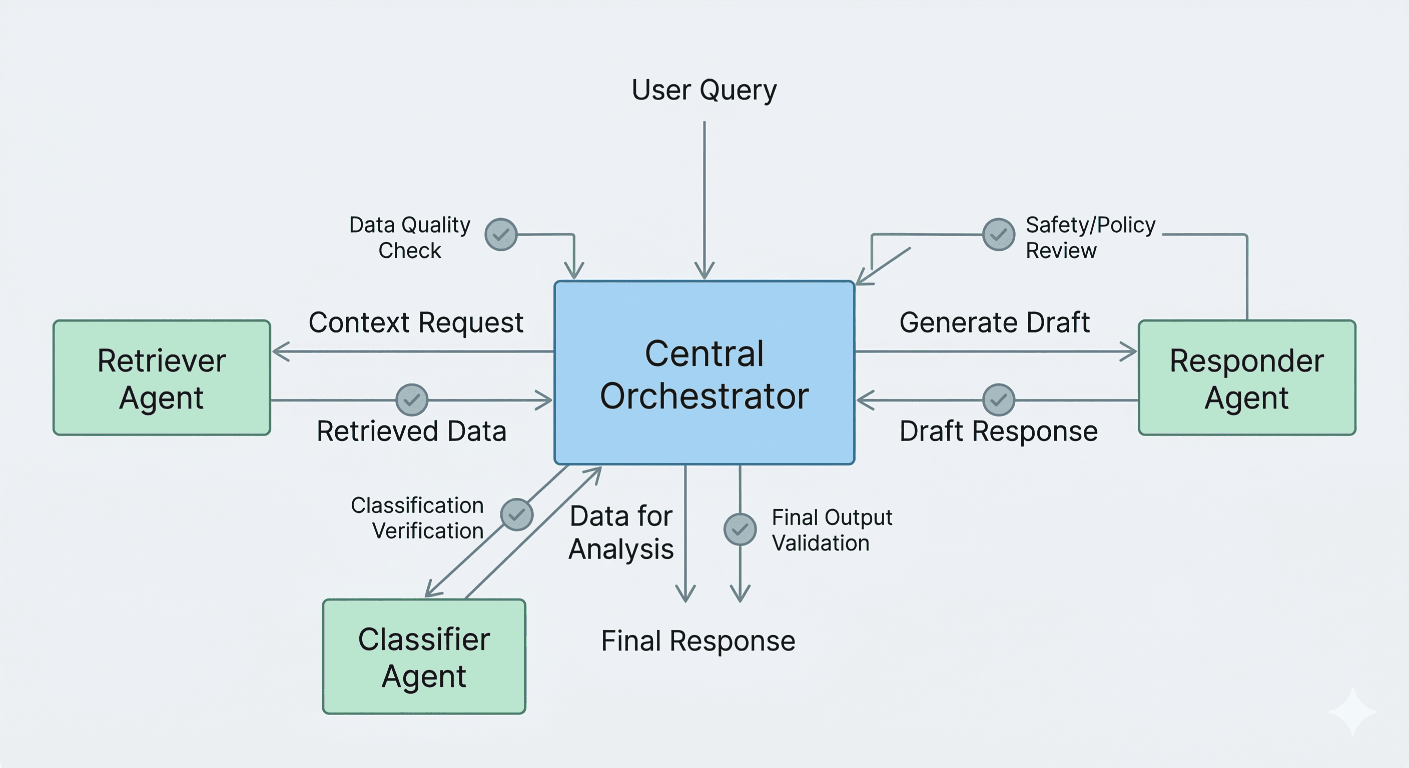 - Responder drafts reply; validator checks safety.